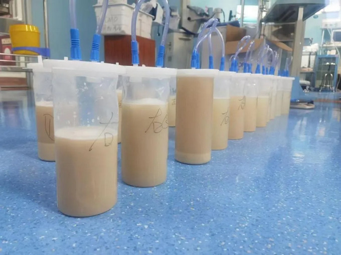 術中,總共使用了33000毫升生理鹽水,大量乳白色的“牛奶”沉淀物被沖洗出來,灌洗液由渾濁逐漸變淡、變清亮。