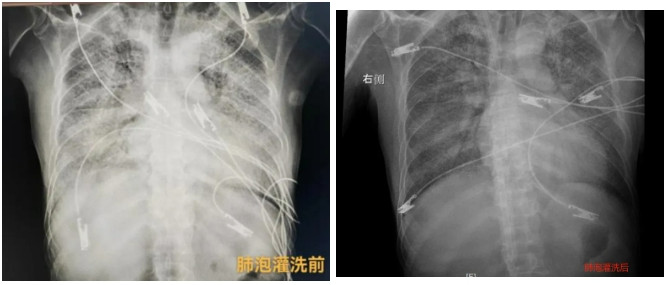 ▲肺泡灌洗前(左)和肺泡灌洗后(右)