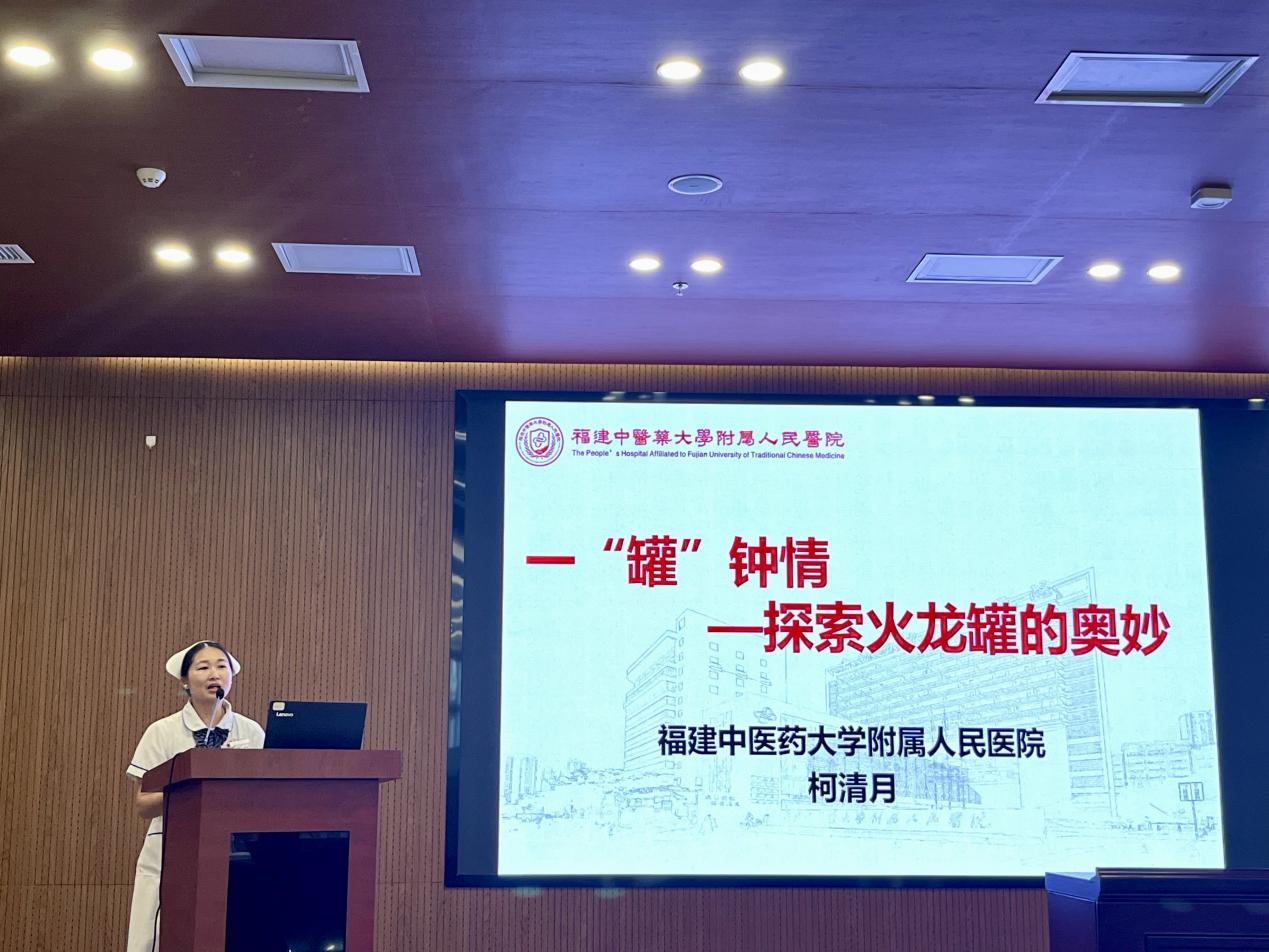 心血管科一區(qū)護士柯清月以“一‘罐’鐘情”為題,分享了中醫(yī)特色技術(shù)火龍罐療法的神奇效果,許多病癥包括周圍性神經(jīng)面癱、便秘、中風(fēng)后肩手綜合征、以及盆腔術(shù)后肢體腫脹等都可以通過火龍罐治療取得顯著療效,這項中醫(yī)特色療法得到了受治療患者的一致好評。