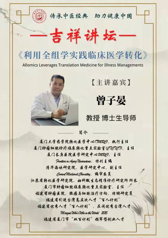 2022年01月14日下午,“吉祥講壇”第六期在我院1號樓附屬樓3層會議室開講。廈門大學藥學院轉(zhuǎn)化醫(yī)學中心執(zhí)行主任、廈門市腫瘤細胞診療臨床轉(zhuǎn)化重點實驗室主任、廈門市長庚醫(yī)院醫(yī)學研究中心主任曾子晏教授蒞臨講授《利用全組學實踐臨床醫(yī)學轉(zhuǎn)化》,各臨床科室的醫(yī)務(wù)人員在現(xiàn)場或通過線上參與講座。