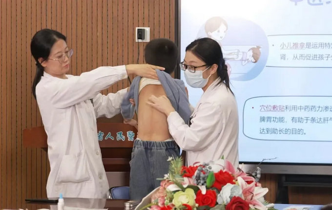 福建中醫(yī)藥大學(xué)附屬人民醫(yī)院兒科主治醫(yī)師盧小露現(xiàn)場(chǎng)教家長(zhǎng)捏脊療法,幫助孩子長(zhǎng)高。