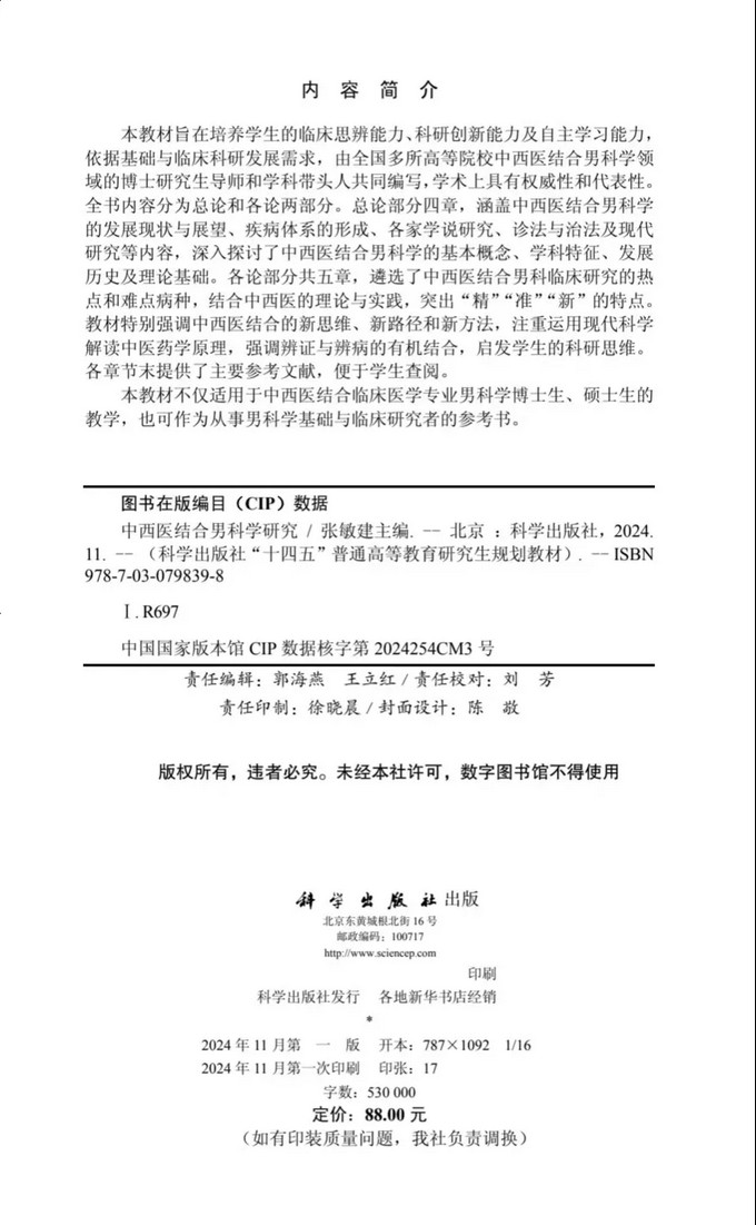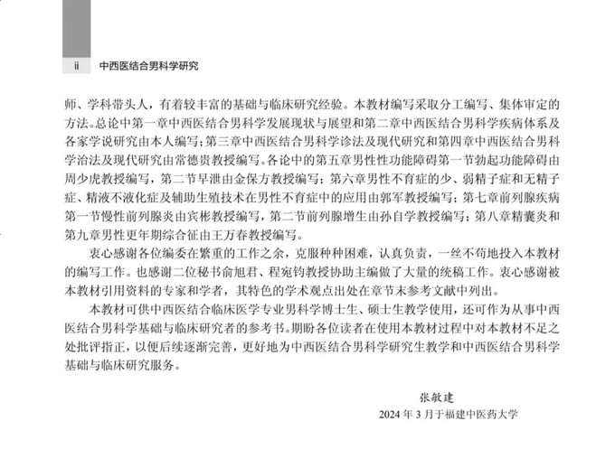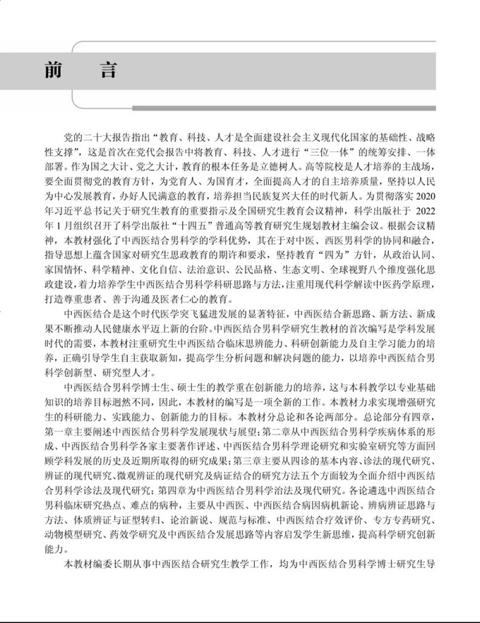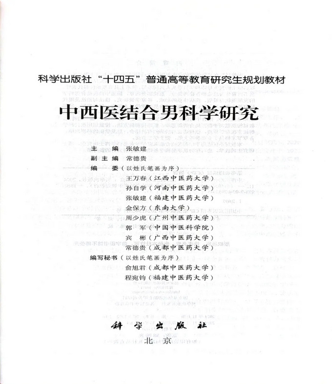 《中西醫(yī)結(jié)合男科學(xué)研究》是科學(xué)出版社 “十四五” 普通高等教育研究生規(guī)劃教材,是全國首部中西醫(yī)結(jié)合男科研究生教材。該教材由8位國內(nèi)中西醫(yī)結(jié)合男科知名教授、博士研究生導(dǎo)師歷時兩年精心編寫,凝聚了全國眾多男科專家智慧與研究成果。