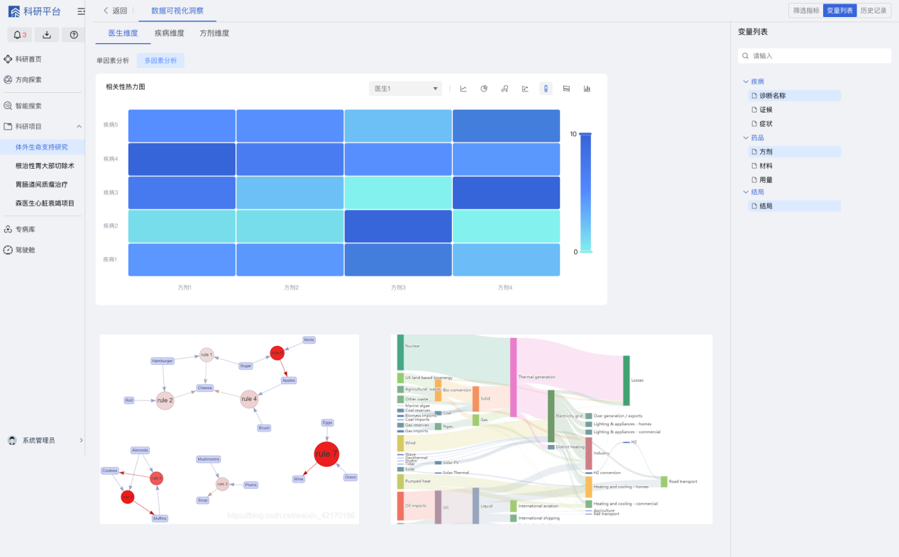 該平臺(tái)涵蓋了數(shù)據(jù)采集治理、知識(shí)檢索、醫(yī)案本地資料共享、研究課題、統(tǒng)計(jì)分析、臨床輔助決策、名中醫(yī)思維傳承學(xué)習(xí)、協(xié)定方及本院制劑人用經(jīng)驗(yàn)挖掘等8大模塊,實(shí)現(xiàn)了醫(yī)院對(duì)名老中醫(yī)數(shù)據(jù)的集成治理、特色方劑及癥狀用藥的檢索、數(shù)據(jù)在線關(guān)聯(lián)規(guī)則分析、貝葉斯網(wǎng)絡(luò)分析、(社團(tuán))聚類分析等多種統(tǒng)計(jì)分析方法,對(duì)接了院內(nèi)的協(xié)定方和本院制劑,形成了院內(nèi)人用經(jīng)驗(yàn)數(shù)據(jù)倉(cāng)。