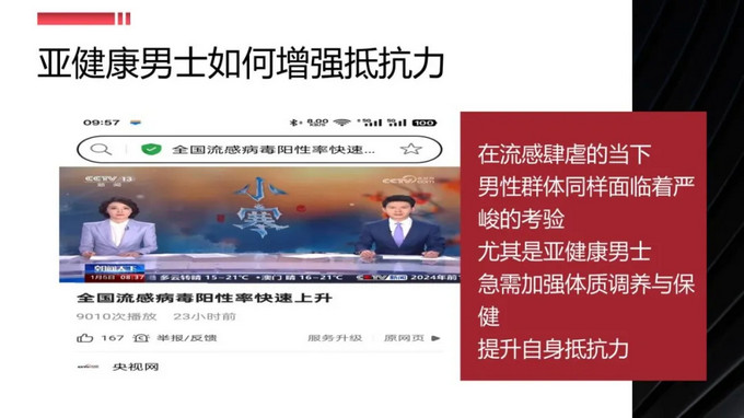 近期,流感高發(fā),據(jù)中國疾控中心最新數(shù)據(jù),目前流感病毒陽性率持續(xù)上升,其中99%以上為甲流。全國多地疾控緊急提醒,要做好個(gè)人防護(hù),注意防范呼吸道傳染病。在流感肆虐的當(dāng)下,男性群體同樣面臨著嚴(yán)峻的考驗(yàn),尤其是亞健康男士,急需加強(qiáng)體質(zhì)調(diào)養(yǎng)與保健,提升自身抵抗力。