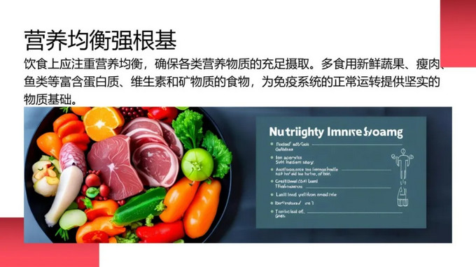 飲食上應(yīng)注重營養(yǎng)均衡,確保各類營養(yǎng)物質(zhì)的充足攝取。多食用新鮮蔬果、瘦肉、魚類等富含蛋白質(zhì)、維生素和礦物質(zhì)的食物,為免疫系統(tǒng)的正常運(yùn)轉(zhuǎn)提供堅(jiān)實(shí)的物質(zhì)基礎(chǔ)。