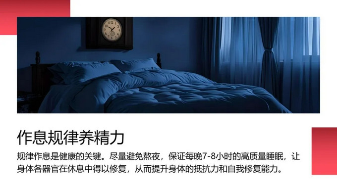 規(guī)律作息是健康的關(guān)鍵。盡量避免熬夜,保證每晚7-8小時(shí)的高質(zhì)量睡眠,讓身體各器官在休息中得以修復(fù),從而提升身體的抵抗力和自我修復(fù)能力。