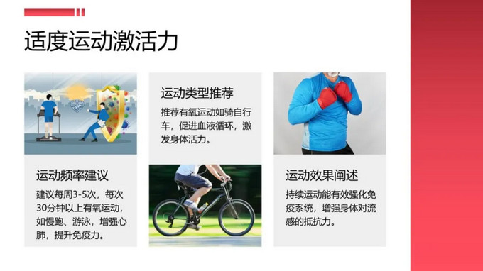 堅(jiān)持每周3-5次、每次30分鐘以上的有氧運(yùn)動(dòng),如慢跑、游泳、騎自行車等,能夠有效促進(jìn)血液循環(huán),增強(qiáng)心肺功能,激發(fā)身體活力,強(qiáng)化免疫系統(tǒng),使身體更好地應(yīng)對(duì)流感威脅。