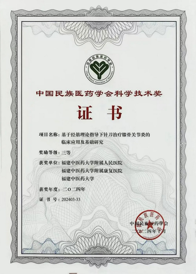 近日,福建中醫(yī)藥大學(xué)附屬人民醫(yī)院骨傷科修忠標(biāo)主任領(lǐng)銜的中醫(yī)骨傷學(xué)科團(tuán)隊(duì)與福建中醫(yī)藥大學(xué)附屬康復(fù)醫(yī)院、福建中醫(yī)藥大學(xué)合作完成的成果《基于經(jīng)筋理論指導(dǎo)下針刀治療膝骨關(guān)節(jié)炎的臨床應(yīng)用及基礎(chǔ)研究》在2024年度中國民族醫(yī)藥學(xué)會(huì)科學(xué)技術(shù)獎(jiǎng)評(píng)選中榮獲三等獎(jiǎng)。