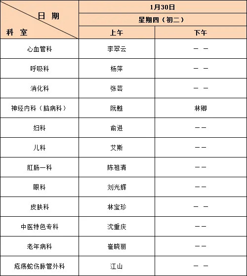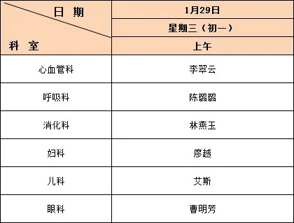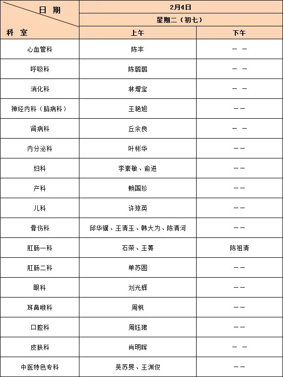 1月28日(農(nóng)歷除夕、周二)至2月4日(農(nóng)歷正月初七、周二)放假調(diào)休,共8天。2月8日(周六)上班,2月8日(周六)上午上原周六上午門診,下午補周一下午門診。放假期間我院實行節(jié)假日門診,具體以醫(yī)院公眾號對外預(yù)約為準。