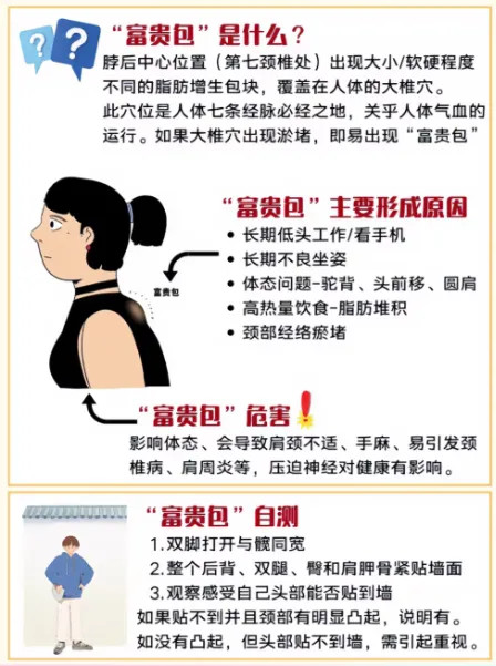 春節(jié)是我國(guó)最受重視的傳統(tǒng)節(jié)日,家庭團(tuán)圓、朋友歡聚,興高采烈地過(guò)完節(jié)后,很多人感到頸椎不適、頸部脂肪堆積“富貴包”。“富貴包“, 醫(yī)學(xué)上常指頸椎后側(cè)脂肪堆積,肌肉緊張或姿勢(shì)性駝背導(dǎo)致的后頸部凸起,可能與不良姿勢(shì)、長(zhǎng)期低頭、頸椎病或脂肪堆積相關(guān)。假期期間,多數(shù)人經(jīng)常長(zhǎng)期玩手機(jī)、玩游戲、發(fā)拜年微信,因而老是保持低頭、脖子前伸、含胸駝背的姿勢(shì),脖子和后背的肌肉因此緊張痙攣,慢慢地還會(huì)變得腫脹,于是慢慢形成了脖子后面的大包。