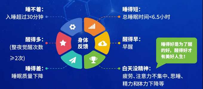 如果存在以下癥狀,你可能也存在睡眠障礙:入睡困難,入睡超過30分鐘,在床上翻來覆去無法入睡;早醒,往往太陽還未升起你的一天就開始了;夜寐不安,頻繁夜醒≥2次/整夜、多夢(mèng);總睡眠持續(xù)時(shí)間短,睡眠時(shí)間通常少于6.5小時(shí)。這些不僅易導(dǎo)致白天沒精神,長期失眠還容易出現(xiàn)注意力不集中、精力和體力下降,甚至?xí)?dǎo)致部分疾病的發(fā)生。
