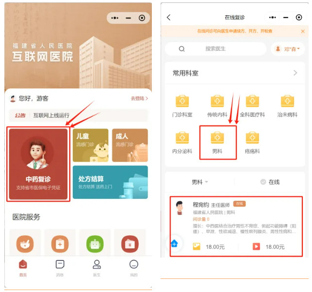 點擊“中藥復(fù)診”→閱讀并同意“服務(wù)協(xié)議”→選擇男科在線醫(yī)生→提交病情表述(描述疾病情況,上傳相關(guān)檢驗、檢查資料)→醫(yī)生接診→開具處方→在線繳費(選擇取藥方式)