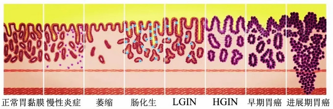 胃黏膜萎縮和腸化生屬于癌前狀態(tài),胃上皮內(nèi)瘤變(gastric intraepithelial neoplasia,GIN)屬于癌前病變,二者均有胃癌發(fā)生風(fēng)險(xiǎn)。其中,胃上皮內(nèi)瘤變既往被稱為不典型增生或異型增生,屬于癌前病變,包括胃低級(jí)別上皮內(nèi)瘤變(low-grade intraepithelial neoplasia,LGIN)和高級(jí)別上皮內(nèi)瘤變(high-grade intraepithelial neoplasia,HGIN)。目前公認(rèn)的胃癌的主要發(fā)生模式為: 正常胃黏膜→慢性炎癥→萎縮性胃炎→腸上皮化生→上皮內(nèi)瘤變→胃癌。