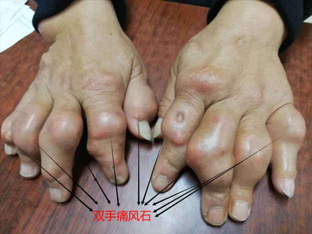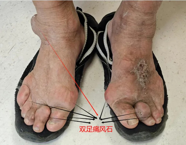 雙手、雙足可見痛風(fēng)石形成