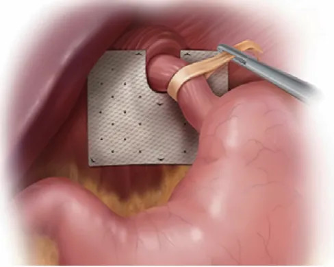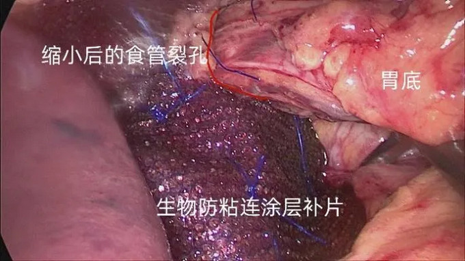 3.腹段食管腹腔化:用倒刺線縫合膈肌角,不可吸收縫線加固縫縮小食管裂孔;