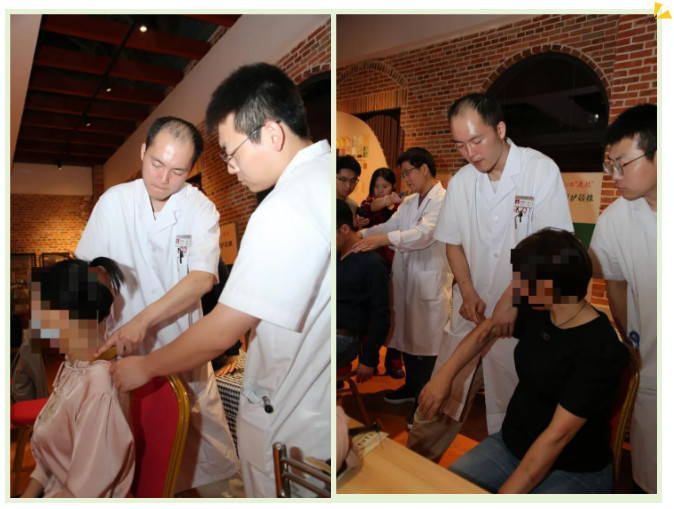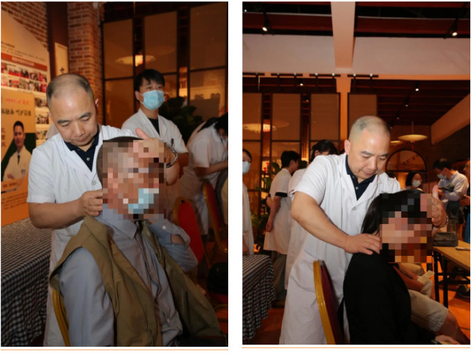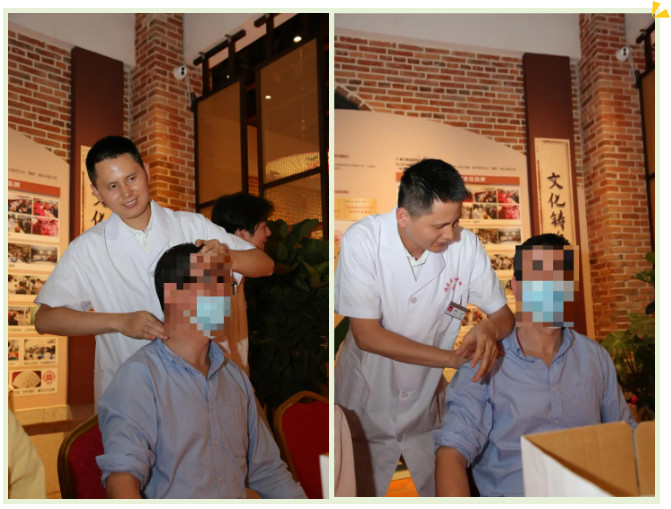 李長輝主任醫(yī)師的指尖如“人體GPS”,在體驗者后頸精準(zhǔn)定位痛點。