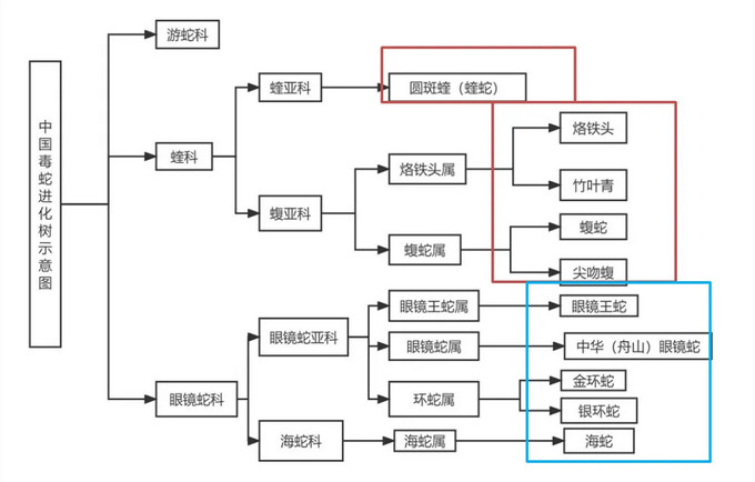 這時候我們要搬出中國毒蛇進(jìn)化樹示意圖(下圖),這張圖相當(dāng)于中國毒蛇的家族族譜。圖中可以看到蝰亞科和蝮亞科的蛇都屬于蝰科的,從生物學(xué)上來說,這兩個分支屬于親戚關(guān)系,蛇毒成分比較接近,就可以使用同一種血清,這就是血清使用的原則之一——同種專一,異種聯(lián)合。第一種情況,被五步蛇咬傷、眼鏡蛇咬傷、銀環(huán)蛇咬傷、蝮蛇咬傷,使用對應(yīng)的蛇毒血清即可;第二種情況,竹葉青蛇咬傷、烙鐵頭蛇咬傷、圓斑蝰蛇沒有對應(yīng)的蛇毒血清,則可以使用抗五步蛇毒血清或(和)抗蝮蛇毒血清;眼鏡王蛇咬傷使用抗銀環(huán)蛇毒血清和抗眼鏡蛇毒血清;金環(huán)蛇咬傷使用抗銀環(huán)蛇血清。