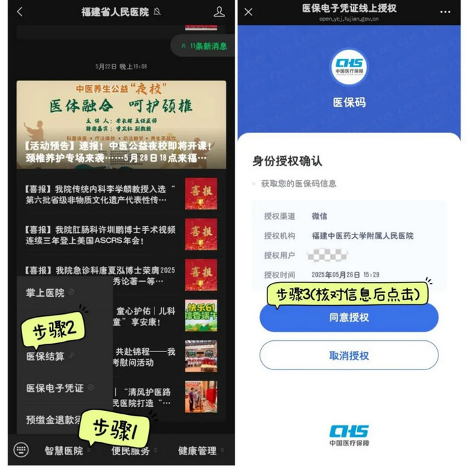(二)醫(yī)保電子碼結(jié)算:患者可通過(guò)關(guān)注我院微信公眾號(hào) “福建省人民醫(yī)院”→ 選擇頁(yè)面左下方“智慧醫(yī)院”→ 選擇“醫(yī)保結(jié)算”→ 點(diǎn)擊“授權(quán)支付”→完成結(jié)算。
