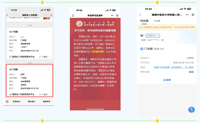 (三)公眾號(hào)推送結(jié)算:患者可關(guān)注我院微信公眾號(hào)“福建省人民醫(yī)院”,當(dāng)存在未結(jié)算費(fèi)用時(shí),我院公眾號(hào)將通過(guò)消息推送的形式提供結(jié)算鏈接,實(shí)現(xiàn)患者無(wú)需到院即可完成結(jié)算。