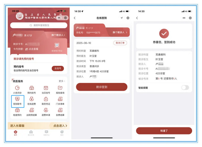1.預(yù)約號簽到(取號):(1)線上簽到:醫(yī)院微信公眾號-智慧醫(yī)院-掌上醫(yī)院-簽到取號;(2)自助機(jī)簽到取號;(3)護(hù)士站簽到取號。