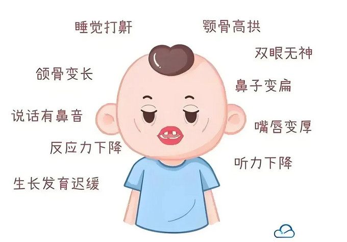 腺樣體肥大是兒童的常見病,肥大的腺樣體壓迫后鼻孔和咽鼓管咽口,鼻咽部分泌物下流刺激咽、喉和下呼吸道,故主要表現(xiàn)為睡覺時打鼾、呼吸音重、張口呼吸、鼻塞,并可有耳悶耳鳴、閉塞性鼻音、咽部不適、清嗓、反復(fù)咳嗽等各種耳鼻咽喉或下呼吸道癥狀,可進一步導(dǎo)致兒童頜面部發(fā)育畸形,出現(xiàn)腺樣體面容,長期缺氧還可導(dǎo)致患兒精神不佳、注意力不集中、學(xué)習(xí)困難、生長發(fā)育緩慢等。