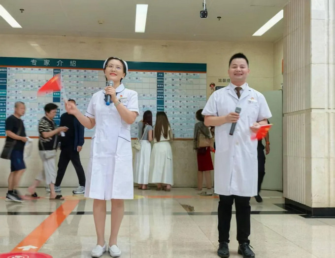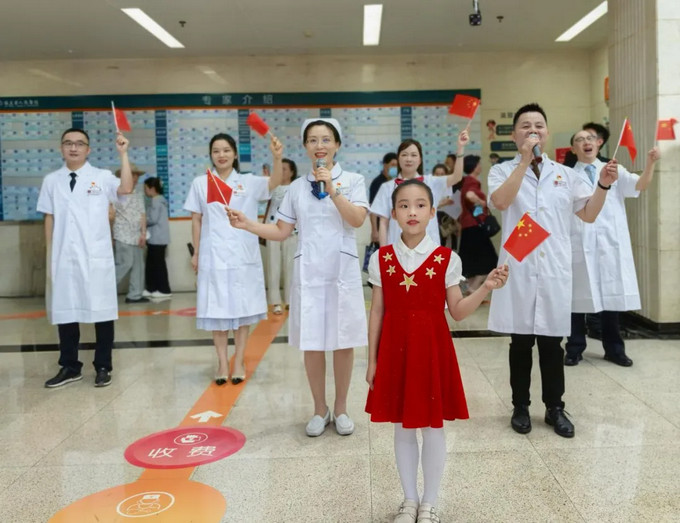 “沒有共產(chǎn)黨就沒有新中國……”“我愛你中國,心愛的母親……”“英雄的鮮血染紅了她……英雄的生命開鮮花”“五星紅旗迎風飄揚,勝利歌聲多么嘹亮”“我和我的祖國,一刻也不能分割”,激情昂揚的旋律,質(zhì)樸有力的歌詞,將就診空間轉(zhuǎn)化為愛國愛黨的情感磁場,吸引現(xiàn)場眾多患者和家屬駐足齊唱。