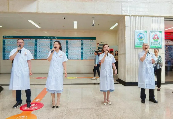 與此同時,1號樓門診大廳正上演一場紅心向黨歌聲揚,快閃燃情致敬黨的紅歌快閃活動,醫(yī)護員工用歌聲致敬建黨104周年。