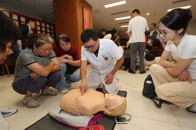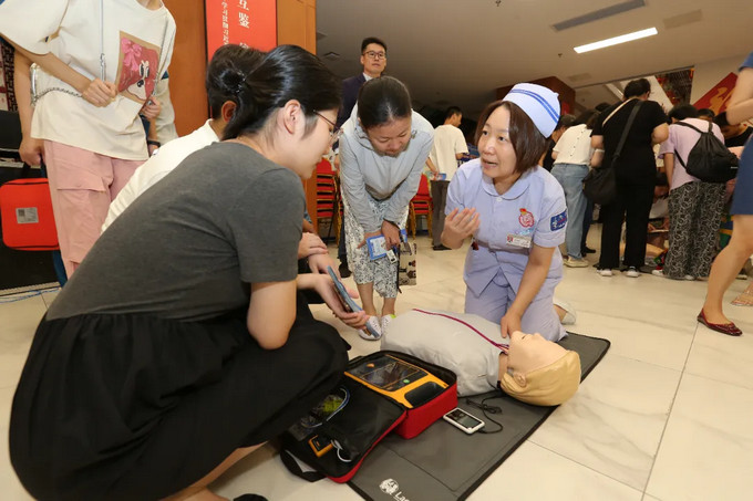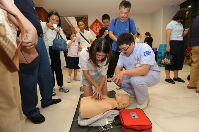 講解結束后,市民朋友們分組體驗,借助專業(yè)測試設備實時校正動作,急診醫(yī)護團隊也在一旁一對一指導,確保每個細節(jié)都規(guī)范。一位寶爸感慨:“終于敢下手了,關鍵時刻能救命!”