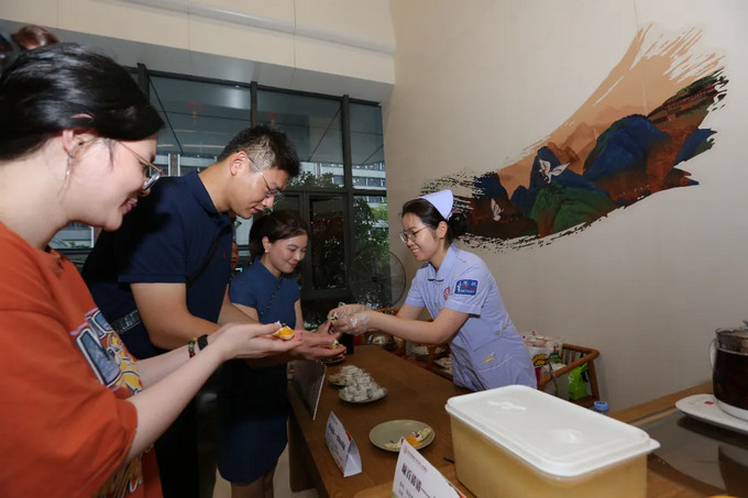 中醫(yī)茶飲藥膳品嘗區(qū)熱鬧非凡,醫(yī)院根據夏季節(jié)氣特點獨創(chuàng)的中藥藥膳茶飲“綠百清清——綠豆百合飲”“烏梅溜溜——烏梅酸湯”“桃紫夭夭——紫蘇桃子姜”“藍山晶晶——藍莓山藥泥”清香四溢,清熱解暑。