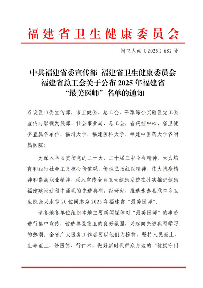 近日,中共福建省委宣傳部、福建省衛(wèi)生健康委員會(huì)、福建省總工會(huì)聯(lián)合揭曉2025年福建省“最美醫(yī)師”名單,福建中醫(yī)藥大學(xué)附屬人民醫(yī)院重癥醫(yī)學(xué)二科副主任(主持工作)陳懷宇主任醫(yī)師,憑借其精湛卓越的醫(yī)術(shù)與醫(yī)者仁心的大愛情懷,光榮入選全省20位“最美醫(yī)師”名單!