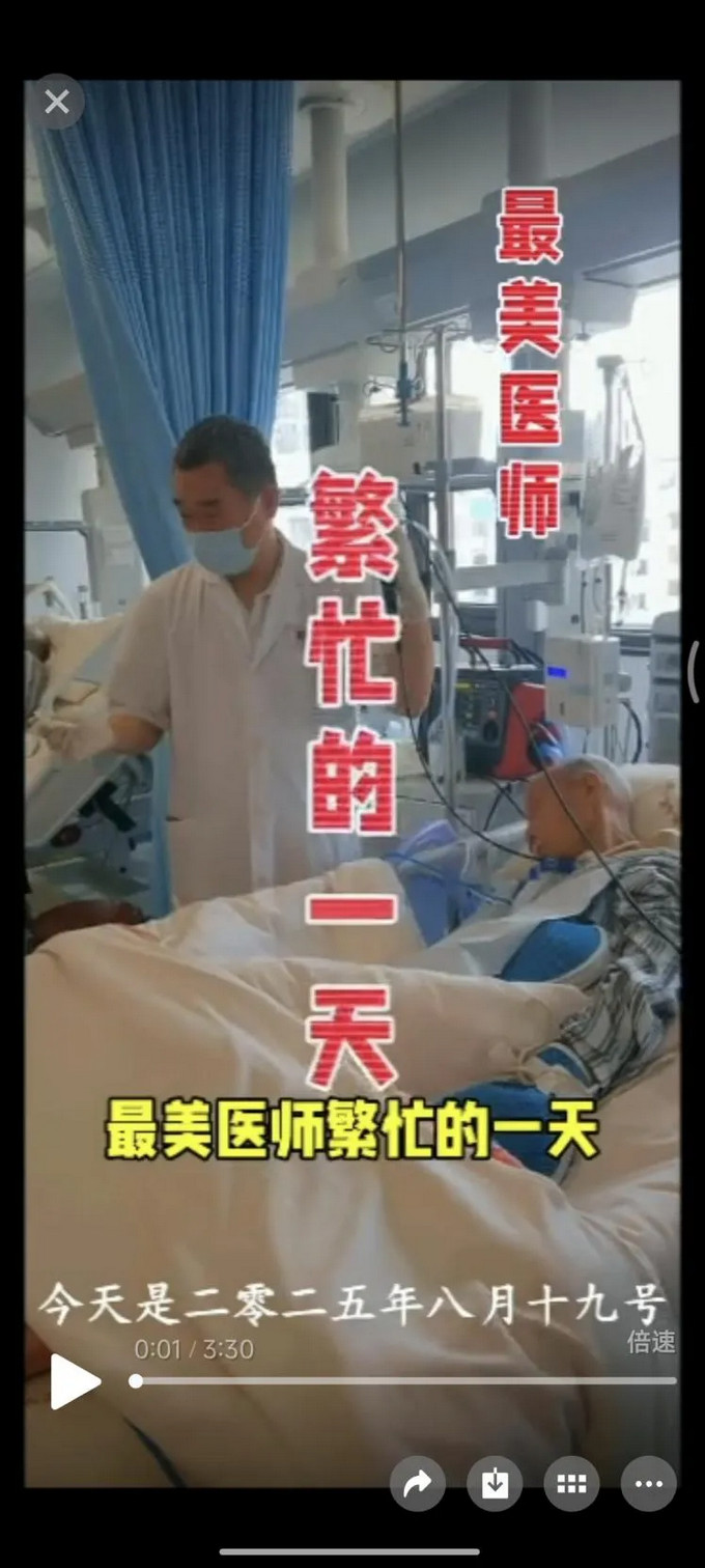 在第八個“中國醫(yī)師節(jié)”來臨之際,一位曾受助于陳懷宇主任團(tuán)隊的患者家屬,特意錄制了一段陳懷宇主任團(tuán)隊在醫(yī)師節(jié)當(dāng)天在亞重癥病房內(nèi)忙碌工作的場景視頻發(fā)送給醫(yī)院以表達(dá)感謝。視頻里,沒有華麗的辭藻,只有家屬動人的話語:“陳主任的聲音是病人最愛聽的聲音,站在鬼門關(guān)前的病人很多都是被這樣呼喚回來,每個病人每天細(xì)微的變化都逃不過他們的眼睛,精益求精是一個好醫(yī)生的標(biāo)準(zhǔn)?,F(xiàn)代醫(yī)術(shù)講究跟病人之間的溝通以及家屬的親情交流,這個科的特色就是很多病人,在醫(yī)生護(hù)士的時刻關(guān)心下,得到了很好的康復(fù)。一個好的醫(yī)師,帶領(lǐng)著一個很好的團(tuán)隊,醫(yī)師節(jié)這一天,這些護(hù)士、值班醫(yī)生包括護(hù)工都在緊張的忙碌著,隨時隨刻都能看到一些滿意的情況,這就是最美醫(yī)師在醫(yī)師節(jié)里面繁忙的一天,走過很多醫(yī)院,看過很多醫(yī)生,在這個地方真正體驗到醫(yī)德和醫(yī)風(fēng)雙馨共佳的局面!”