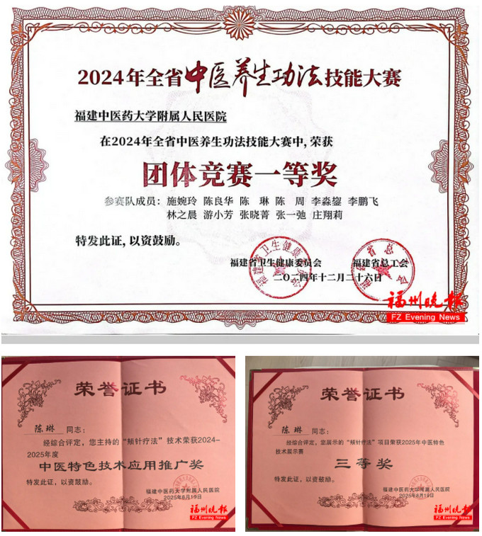 這兩年,陳琳也獲得不少獎項:2024年全省中醫(yī)養(yǎng)生功法技能大賽團體競賽一等獎;“頰針療法”項目榮獲2025年中醫(yī)特色技術展示賽三等獎;“頰針療法”技術榮獲2024—2025年度中醫(yī)特色技術應用推廣獎。