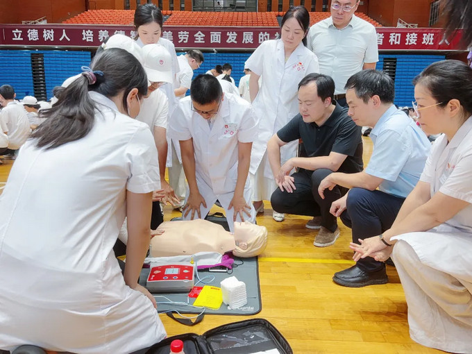 活動(dòng)現(xiàn)場,我院醫(yī)療急救團(tuán)隊(duì)吳暉主任一行13名醫(yī)護(hù)人員結(jié)合校園及生活中常見的突發(fā)安全案例,從理論到實(shí)踐,細(xì)致拆解突發(fā)狀況應(yīng)對(duì)要點(diǎn)。借助人體模型,團(tuán)隊(duì)規(guī)范演示了心肺復(fù)蘇的按壓深度與頻率、海姆立克急救法的操作細(xì)節(jié)、自動(dòng)體外除顫器(AED)的使用流程,每一個(gè)動(dòng)作都講解到位、演示清晰,確保師生能看清操作要點(diǎn)、弄懂原理邏輯、掌握核心技能。