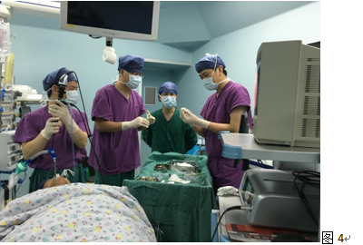 洪旭初主任組織了呼吸胸外聯(lián)合病房的醫(yī)生們共同分析了患者的病情。因患者病史較長,氣管鏡下所見異物周圍及管腔內(nèi)部均有肉芽腫形成,與周圍組織黏連明顯,可能出現(xiàn)剝離困難導(dǎo)致出血風險,且異物崁頓位置在左肺下葉后基底段亞段,位置極深,操作難度極大;針對患者的特點,各位專家經(jīng)過多輪熱烈討論后,共同制定了治療方案:經(jīng)纖支鏡左下肺后基底段取異物術(shù)備轉(zhuǎn)胸腔鏡下或開胸后基底段異物取出術(shù),內(nèi)外聯(lián)手,確保一次上臺就能解決患者異物問題,同時對術(shù)中可能出現(xiàn)的所有風險制定了各方面應(yīng)急預(yù)案。經(jīng)過各方面充分準備,4月10日下午于手術(shù)室嚴密的循環(huán)呼吸監(jiān)護下全麻氣管插管進行手術(shù)(圖4)。
