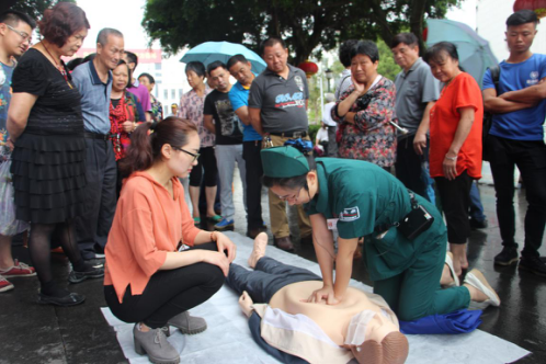 雖然零星下著小雨,在潮濕的地面上,急救護理專家不厭其煩為群眾培訓(xùn)徒手心肺復(fù)蘇。“就像會騎自行車一樣,我們希望簡單的急救常識人人都會,這樣在緊急的時刻能救人一命?!奔痹\科護士說。