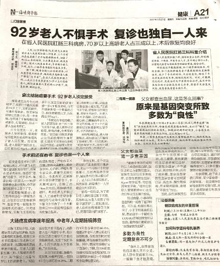 【媒體看省人醫(yī)】海峽都市報道我院肛腸三科王振飛主任給92歲老人做結腸癌手術