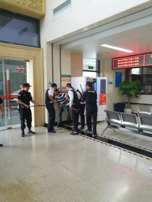 并由我院保安隊、應(yīng)急隊及洋中派出所警官共同參與現(xiàn)場反恐防爆演練。 一名由保安隊長扮演的“可疑人員”,來到 1號樓大廳服務(wù)臺與導(dǎo)診護士發(fā)生爭吵、衍變成動手打人。應(yīng)急小組收到后準備防暴工具趕撲現(xiàn)場與保安人員立即手握鋼叉上前擋住“歹徒”,大家齊心協(xié)力把“歹徒”逼退至大廳角落,“歹徒”被鋼叉叉得不能動彈,“歹徒”手中的兇器隨即被奪下, “歹徒”被制服。