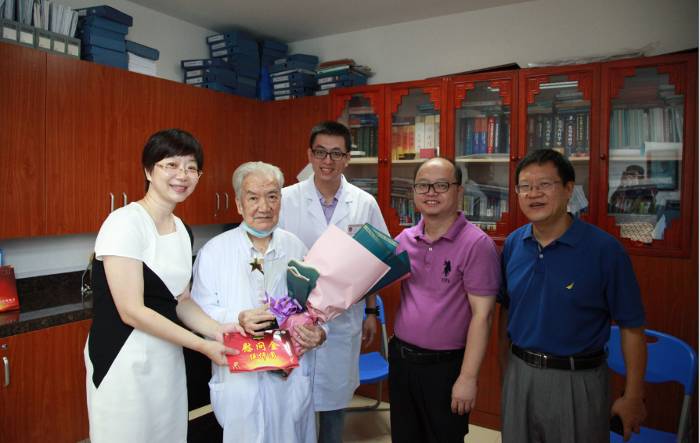 劉雪松副處長(zhǎng)、謝玲華副秘書長(zhǎng)給陳民藩主任醫(yī)師帶去名醫(yī)風(fēng)采錄、慰問(wèn)金、“福建名醫(yī)”水晶杯和鮮花。院領(lǐng)導(dǎo)文丹副院長(zhǎng)、肛腸科副主任王菁陪同