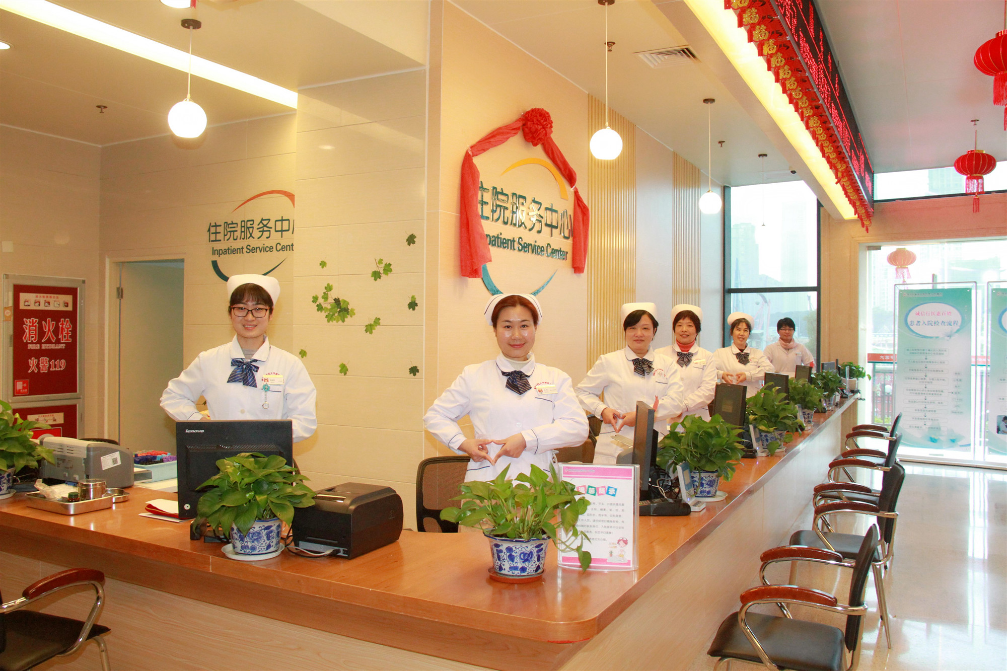 住院服務(wù)中心位于福建中醫(yī)藥大學(xué)附屬人民醫(yī)院一號(hào)樓一層,路線引導(dǎo)標(biāo)識(shí)醒目。中心設(shè)有候診大廳、8個(gè)對(duì)外服務(wù)窗口(其中有4個(gè)入院登記窗口、2個(gè)抽血窗口、2個(gè)繳費(fèi)窗口)、花園式入院宣教區(qū)、床位協(xié)調(diào)辦公室。同時(shí)中心還配備候診椅、自助取號(hào)機(jī)、LED顯示屏及叫號(hào)系統(tǒng)和其他相關(guān)設(shè)備設(shè)施,墻上一臺(tái)大電視每天向患者、家屬們滾動(dòng)播放醫(yī)院各類入院須知,包括如何正確使用病房的各種設(shè)備、醫(yī)院的規(guī)章制度、入院前要做哪些檢查、醫(yī)院各科室位置介紹、醫(yī)院內(nèi)及周邊環(huán)境介紹等。中心的護(hù)士長(zhǎng)會(huì)邀請(qǐng)患者、家屬觀看視頻,發(fā)放各類入院宣傳材料,面對(duì)面向患者、家屬介紹住院過(guò)程中的各種注意事項(xiàng),答疑解惑。