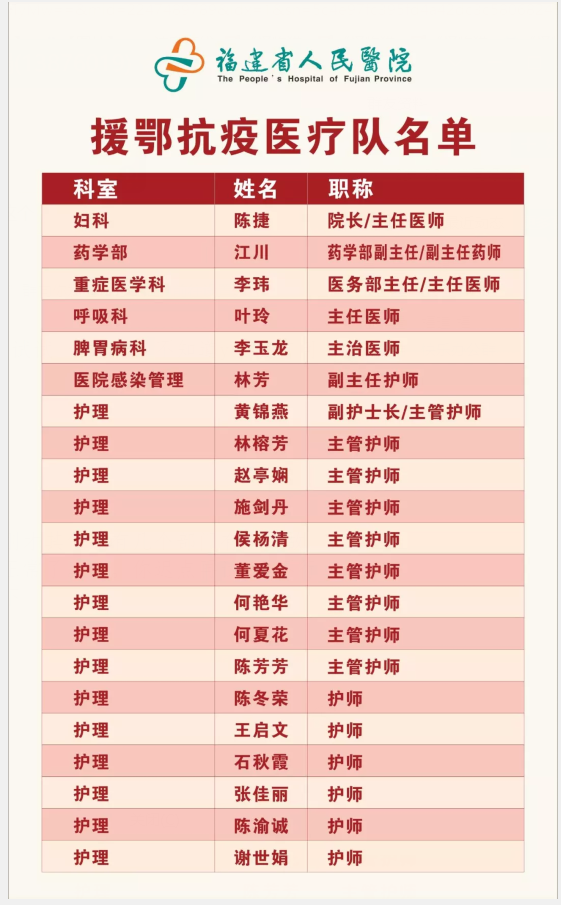 2月15日,根據(jù)國(guó)務(wù)院應(yīng)對(duì)新型冠狀病毒肺炎疫情聯(lián)防聯(lián)控機(jī)制醫(yī)療救治組最新工作部署,福建省再次組建107人的醫(yī)療隊(duì)支援湖北武漢,由福建中醫(yī)藥大學(xué)附屬人民醫(yī)院陳捷院長(zhǎng)擔(dān)任總領(lǐng)隊(duì)。福建中醫(yī)藥大學(xué)附屬人民醫(yī)院從各科室眾多請(qǐng)戰(zhàn)人員中遴選出21名精銳人員組成醫(yī)療隊(duì)。