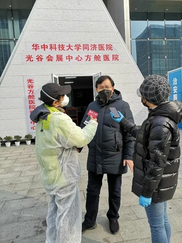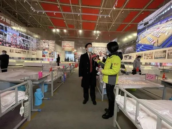 主持人劉煒在光谷會展中心方艙醫(yī)院采訪唐洲平教授