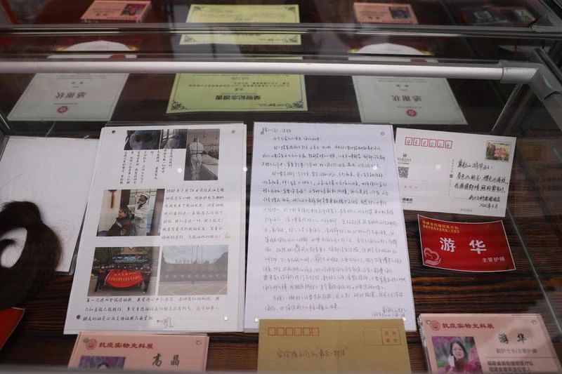 在觸手可及的實物展品前,觀看者林女士的思緒一下被帶回到年初那段眾志成城,共克時艱的抗疫歲月??粗爢T們一張張從福州飛往武漢天河國際機場的機票,摁著紅手印的請戰(zhàn)書,以及抗疫隊員穿壞的雨靴時,她腦海中重新浮現(xiàn)出白衣天使們義無反顧,轉(zhuǎn)身逆行的感人畫面,不禁眼眶濕潤。