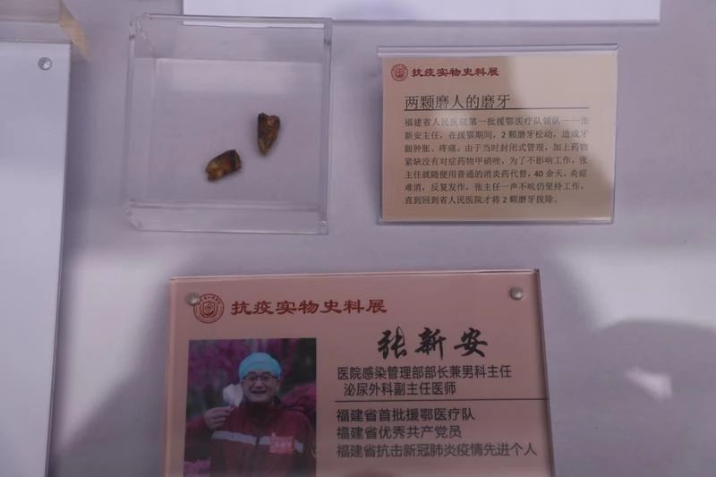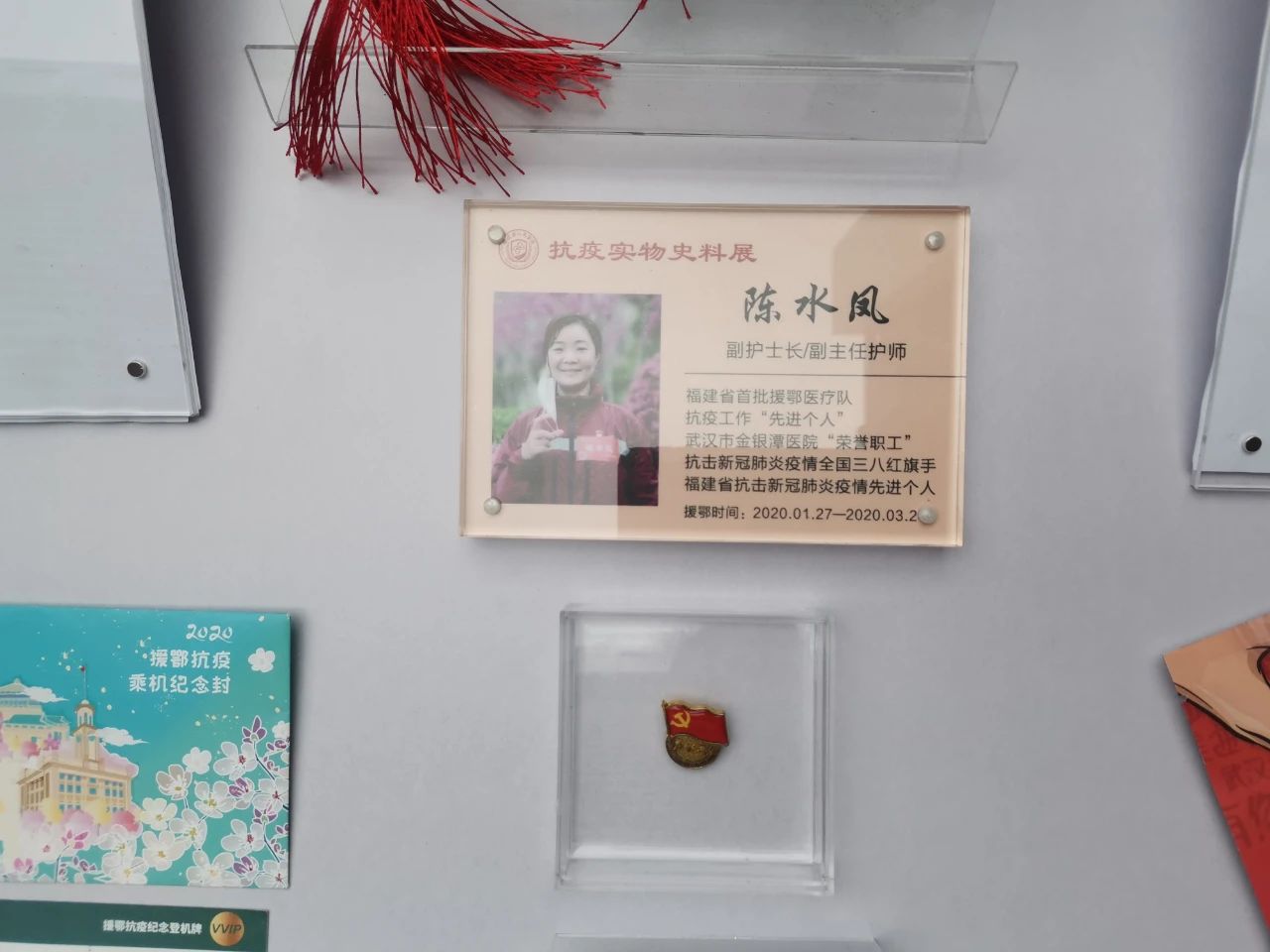 展示區(qū)內(nèi)陳列著當時援鄂醫(yī)療隊員各類珍貴的實物、圖片、資料,集中展現(xiàn)了醫(yī)務(wù)人員把人民生命安全和身體健康放在第一位,無私奉獻,救死扶傷,大愛無疆的醫(yī)者精神。其中一枚略帶銹跡的黨徽顯得十分特別。黨徽的主人陳水鳳在抗疫期間每日佩戴著它,雖然被消毒水多次擦拭,黨徽鮮亮的油漆逐漸褪色,但正是黨員的榮光,成為她抗疫期間不斷前行的信念之源。