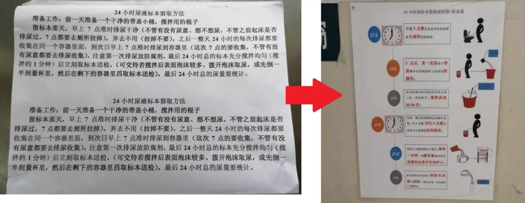對于“24小時尿標(biāo)本的留取”,護(hù)士們除了口頭對病人講解,還將宣教文字轉(zhuǎn)化成形象生動、便于理解的流程圖,在每個病房里都張貼一張,讓患者能夠清晰的理解如何留取24小時尿標(biāo)本。