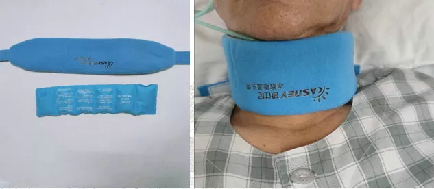 甲狀腺微波消融術(shù)后患者,需要用冰袋冷敷,防止術(shù)后傷口出血,預(yù)防頸部腫脹,緩解疼痛。但是冰敷頸部的過程中,患者需要用毛巾包裹冰袋,并一直用手扶冰袋,影響活動與休息,很不方便。于是,胸心外科的護(hù)士采購了頸部專用冰敷帶,可以有效固定頸部冰袋并且能調(diào)節(jié)松緊,真正解放患者雙手,還不影響冰敷治療。