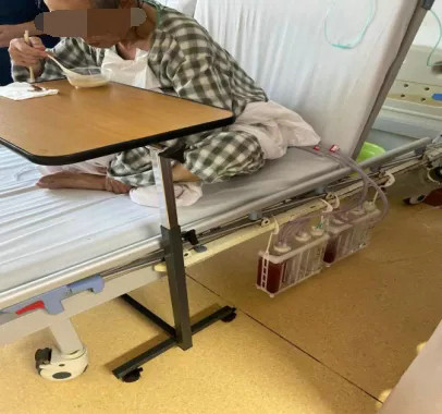 在胸心外科,術(shù)后大多留置胸腔閉式引流瓶。一天,護(hù)士長發(fā)現(xiàn)留置胸瓶,患者在床上吃飯成了個“難題”。病床自帶的桌板需要把兩邊護(hù)欄拉起來,但是胸管又不能高于切口。要是不用拉起護(hù)欄也能用個小桌子就好了。經(jīng)過研究討論,科室自費(fèi)購買了床上桌,專為留置胸瓶患者使用,吃飯問題也就迎刃而解了。
