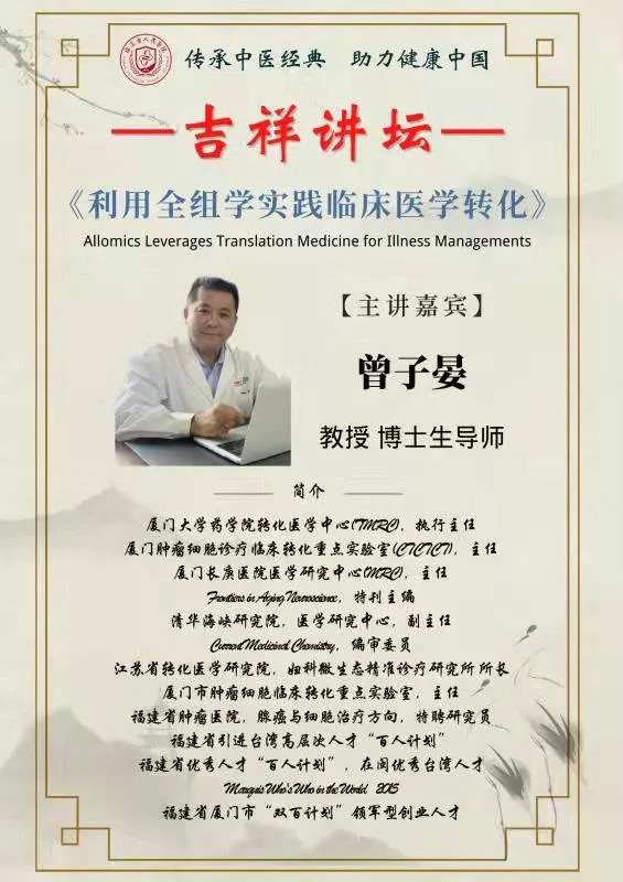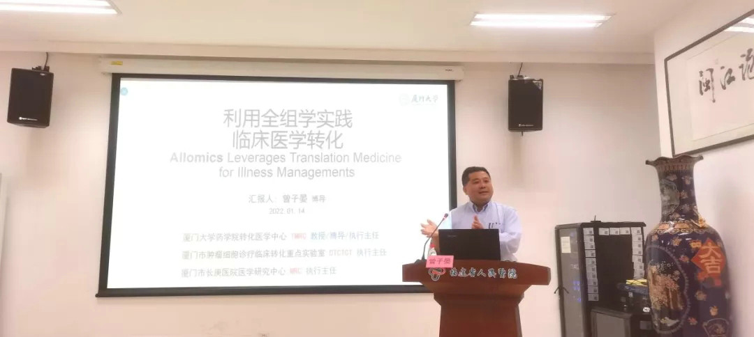 2022年01月14日下午,“吉祥講壇”第六期在我院1號(hào)樓附屬樓3層會(huì)議室開講。廈門大學(xué)藥學(xué)院轉(zhuǎn)化醫(yī)學(xué)中心執(zhí)行主任、廈門市腫瘤細(xì)胞診療臨床轉(zhuǎn)化重點(diǎn)實(shí)驗(yàn)室主任、廈門市長(zhǎng)庚醫(yī)院醫(yī)學(xué)研究中心主任曾子晏教授蒞臨講授《利用全組學(xué)實(shí)踐臨床醫(yī)學(xué)轉(zhuǎn)化》,各臨床科室的醫(yī)務(wù)人員在現(xiàn)場(chǎng)或通過(guò)線上參與講座。