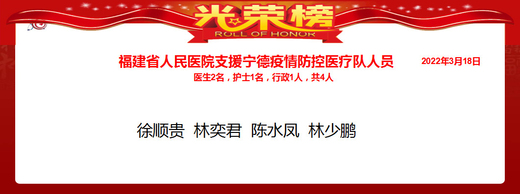 3月18日,福建省人民醫(yī)院派出徐順貴、陳水鳳、林少鵬、林奕君4名同志赴寧德督導(dǎo)疫情工作。