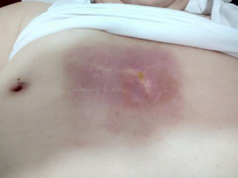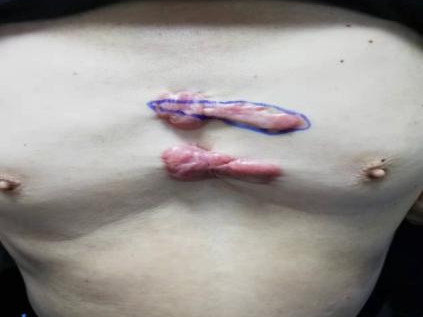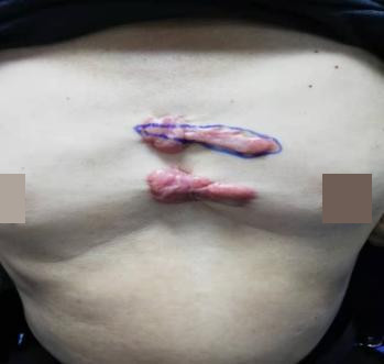 患者陳某,60歲,胸部瘢痕疙瘩增生35年,時(shí)常自覺瘙癢,衣物摩擦可有觸痛不適,曾自己嘗試通過網(wǎng)絡(luò)途徑購(gòu)買多種價(jià)格高昂“祛疤藥物”治療,疤痕不僅沒有得到緩解,反而進(jìn)行性增生加重。遂就診多家醫(yī)療機(jī)構(gòu)先后進(jìn)行注射、切除等多種診療,但瘢痕疙瘩反而增生較前更大。后經(jīng)人介紹來到福建省人民醫(yī)院皮膚科,經(jīng)詳細(xì)檢查后,王斗訓(xùn)副主任醫(yī)師團(tuán)隊(duì)最終制定了中西醫(yī)結(jié)合的診療方案:先行手術(shù)切除瘢痕疙瘩組織,創(chuàng)面拆線后行淺層放療SRT-100,后期配合內(nèi)服桃仁、藏紅花、浙貝母、昆布等活血化瘀、軟堅(jiān)散結(jié)方劑,外用專科制劑“積雪草油”按摩、穴位封閉、協(xié)定方中藥熏蒸、火針等,內(nèi)外聯(lián)合,標(biāo)本兼顧。治療1年后復(fù)查,瘢痕未再增生,患者對(duì)療效非常滿意。
