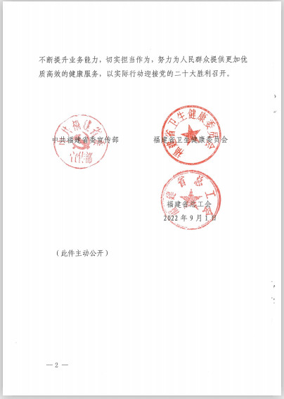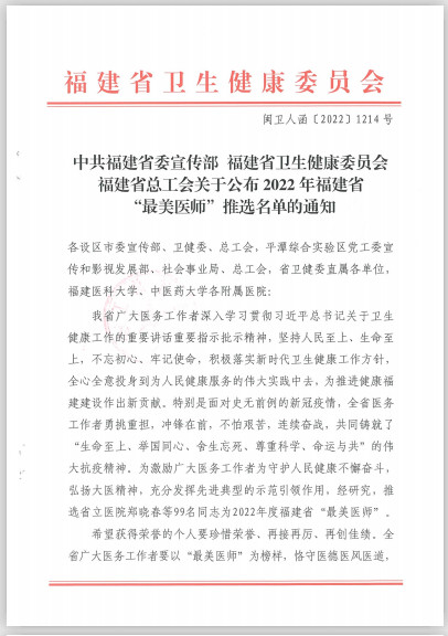 近日,中共福建省委宣傳部、福建省衛(wèi)生健康委員會(huì)、福建省總工會(huì)公布99名福建省“最美醫(yī)師”名單,我院腎病科丘余良、消化科林瓊2位同志入選,榮獲2022年福建省“最美醫(yī)師”稱號(hào)。